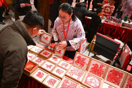 ??2026年2月15日,觀眾在北京中國工藝美術館舉辦的“過年——丙午春節系列主題展”上挑選生肖馬剪紙作品。