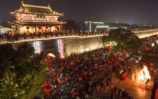 ??2026年2月14日,市民游客在湖北襄陽古城觀看 “千燈臨漢 萬戶迎春”迎新春演出(無人機照片)。